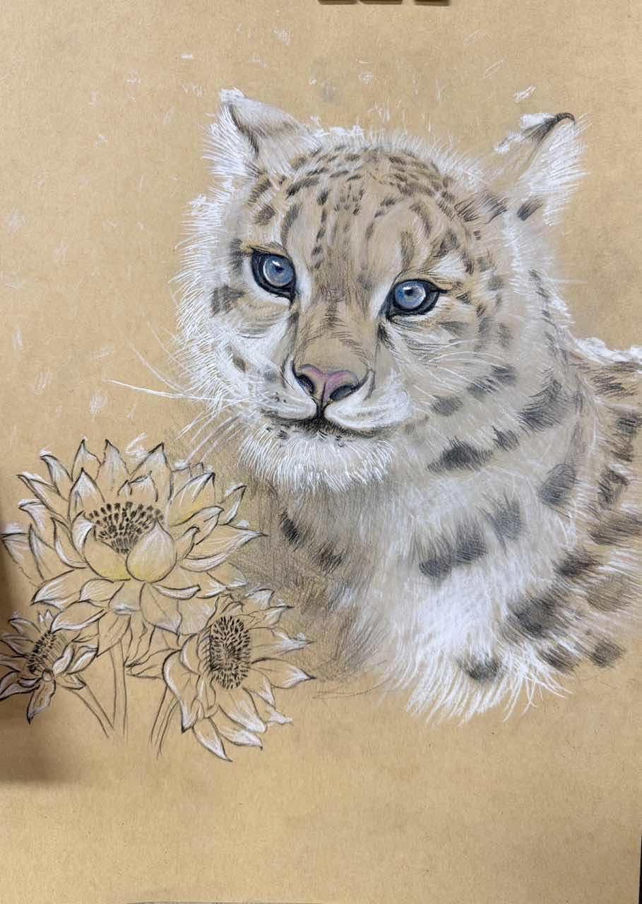 在这50多幅作品中,我们既看到雪豹孤影轻跃于天山岩壁间的灵动,也遇见赤狐回眸时那一瞬清澈如水的眼神;既有雪莲花在冰雪中静静绽放的芬芳与傲骨,也可见少年们心怀天地,将对遥远丛林、深蓝海洋乃至整个星球生灵的喜爱与关注,悄然落笔成温暖的色彩。青少年们用有限的创作时间,迸发出无限的创意与情感,将新疆多样而珍贵的野生动植物形态,真挚而动人地定格于画布之上。