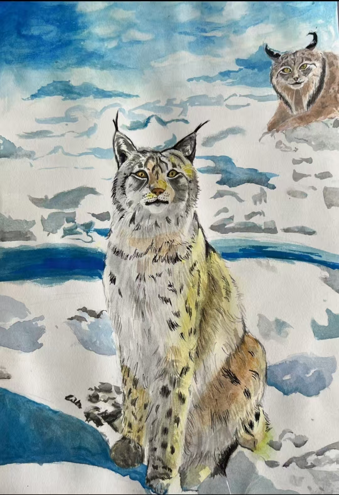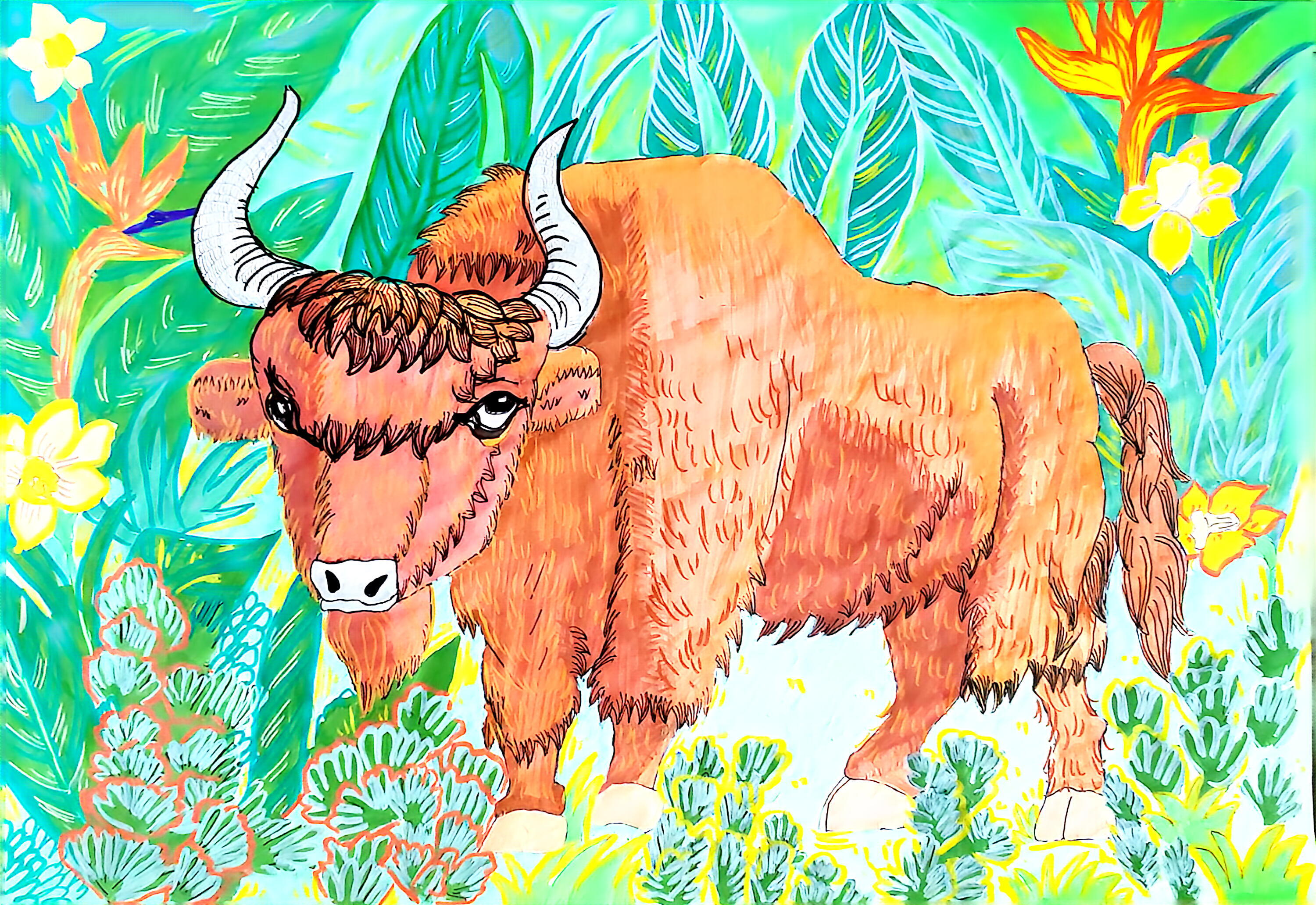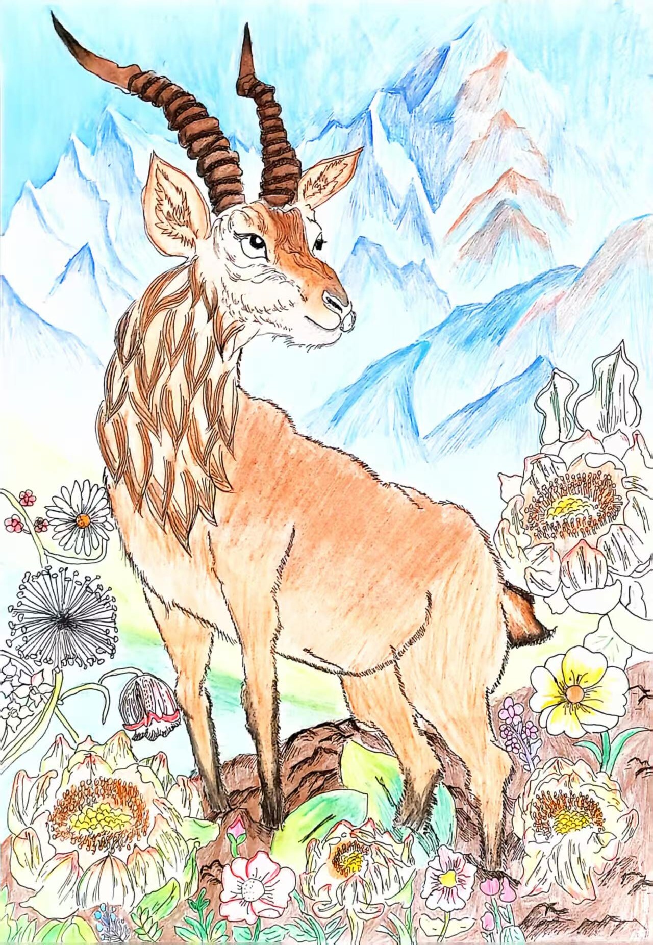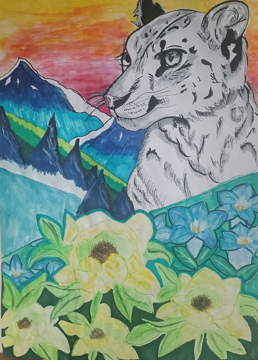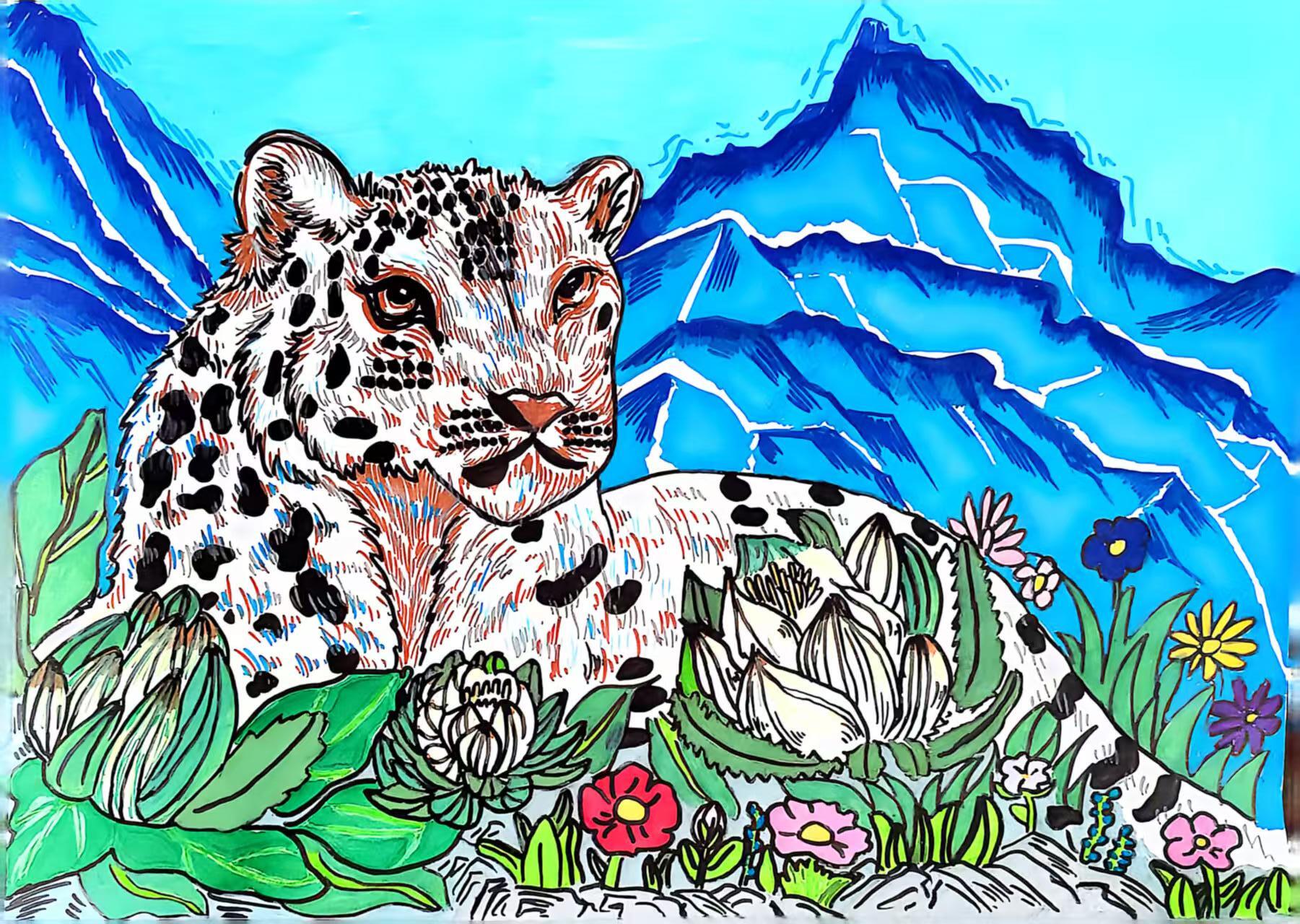 在这50多幅作品中,我们既看到雪豹孤影轻跃于天山岩壁间的灵动,也遇见赤狐回眸时那一瞬清澈如水的眼神;既有雪莲花在冰雪中静静绽放的芬芳与傲骨,也可见少年们心怀天地,将对遥远丛林、深蓝海洋乃至整个星球生灵的喜爱与关注,悄然落笔成温暖的色彩。青少年们用有限的创作时间,迸发出无限的创意与情感,将新疆多样而珍贵的野生动植物形态,真挚而动人地定格于画布之上。